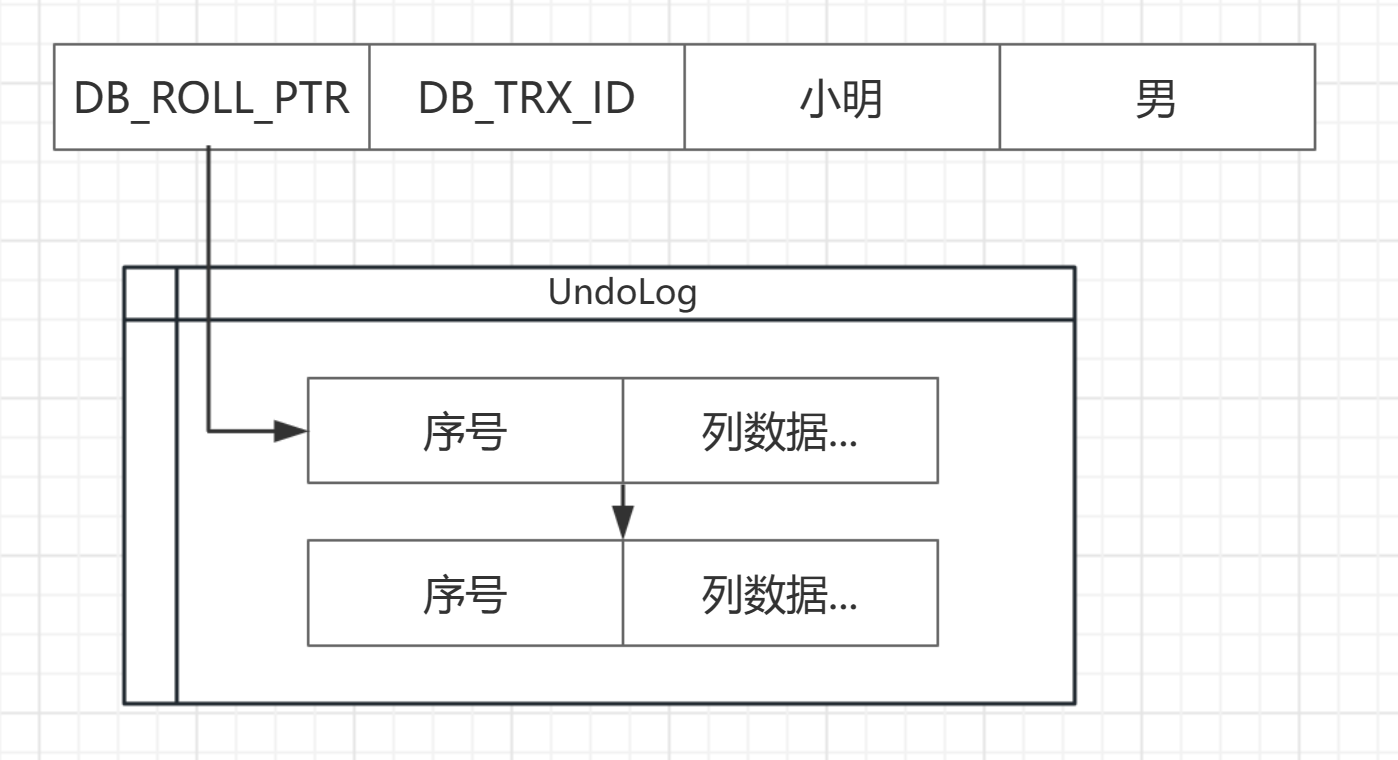 DB_ROLL_PTR:回滚指针标识如果要回滚的话上一个版本的数据的标识,用于维护历史版本链,数据在UndoLog中