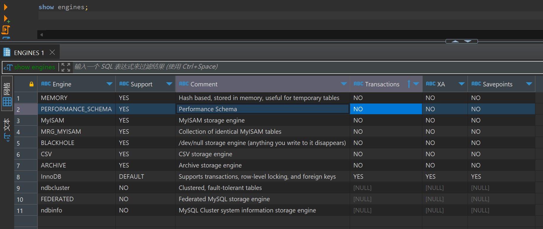 如图可以看到标明了当前支持的引擎以及是否支持Transactions、XA、以及Savepoints