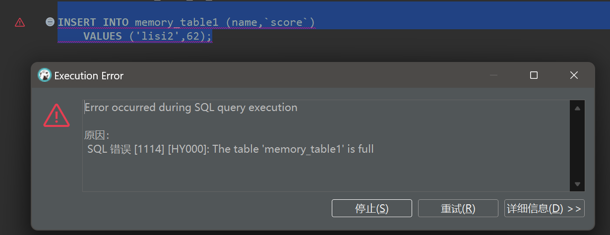 如果到了上限再插入数据会提示The table 'memory_table1' is full