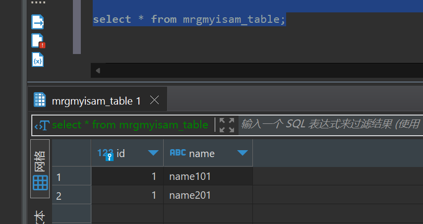 查询mrgmyisam_table表数据可以发现查询出来了合并的两张表的数据