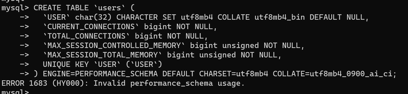 如图PERFORMANCE_SCHEMA引擎不让用户创建提示Invalid performance_schema usage.