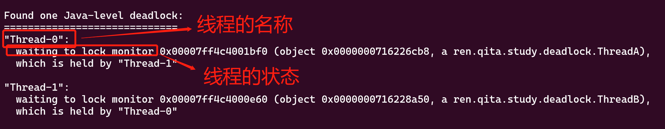 Thread-0 是在waiting to lock monitor状态也就是在等待锁定监视器,也就是在等待一个同步区然后下面再告诉我们which is held by "Thread-1"由Thread-1持有,也就是说在等待Thread-1释放掉之后它才执行。然后下面就打印了Thread-1的状态它也在waiting to lock monitor 并且说which is held by "Thread-0"意思是不是就是说他也在等待进入同步区,但是目前Thread-0在持有这个锁,这样就是Thread-1在等Thread-0释放,然后Thread-0在等Thread-1释放,就是死锁了。