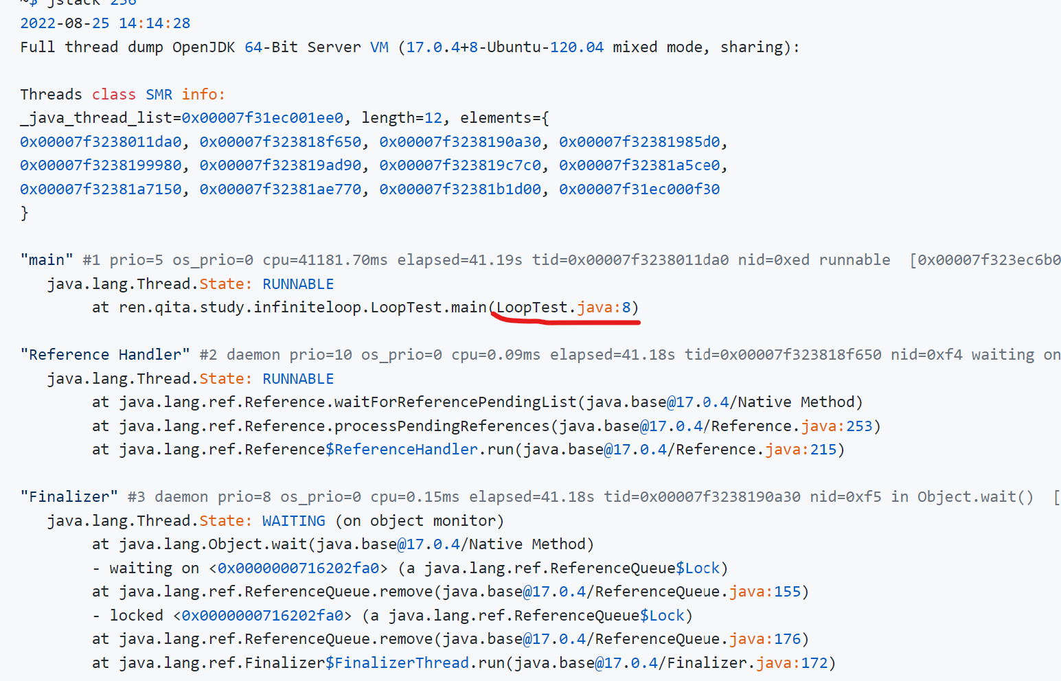 这个时候按照平时在本地就是打个断点调一下,看看走到哪里卡住了有问题,在现实虽然说也能远程debug,但是线上一般不这么做,因为通过线程堆栈也能看到线程的执行情况那就是jstack命令。